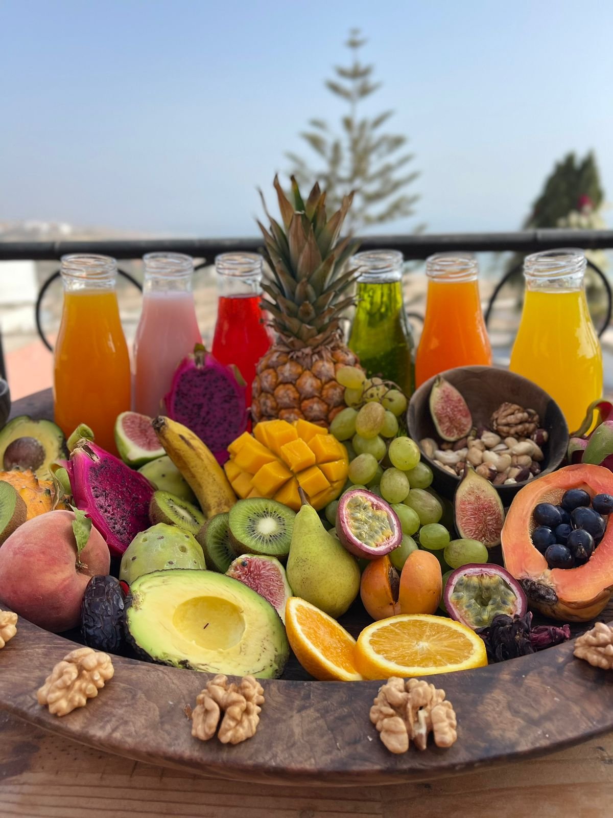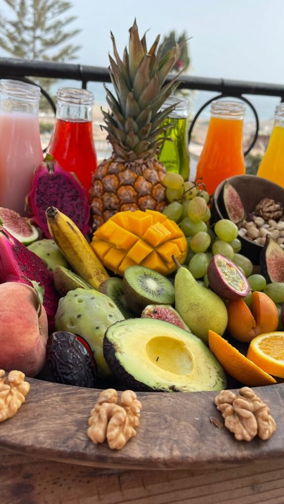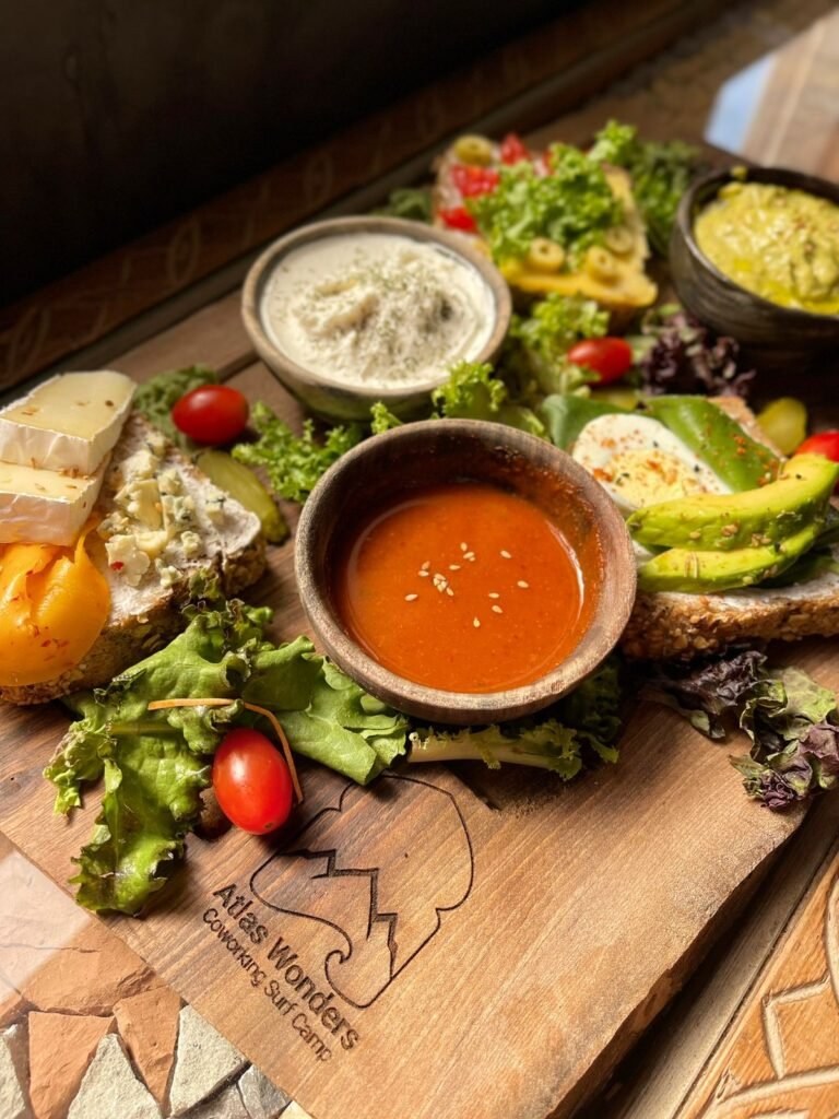Welcome to our surf camp cafeteria — the heart of our community. We specialize in authentic Moroccan cuisine prepared with fresh, seasonal ingredients and a focus on healthy eating. Alongside our fragrant tagines, classic couscous, fresh seafood, and colorful salads, you’ll find smoothies, healthy shots, homemade treats, hot drinks, and other fresh seasonal products. Each meal is thoughtfully prepared to refuel your energy after a surf session while immersing you in the vibrant, wholesome flavors of Morocco.